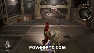 Once you’re in the second section of the middle floor, drop across the beams until you reach the stairs leading towards the enemy that gives you the key. To the right of those stairs, there will be a door where you can drop down to a platform with an elevator. Take the elevator up and the jammer will be on the platform below you.